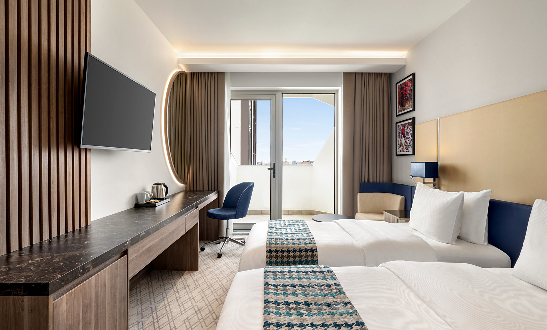 The rooms are designed for guests who appreciate the classics and comfort. Each room consists of one room with two single beds, a wardrobe with all the necessary accessories inside. Each room has a separate bathroom with a shower, made in a modern style, equipped with all necessary cosmetic and bath accessories - a hairdryer, slippers, a set of towels and toiletries. The rooms are equipped with a safe, a mini-bar, an electric kettle, a work area with a comfortable desk, a comfortable armchair and separate lighting. Each room has an iron and ironing board. The area of this room is approximately 21m2.