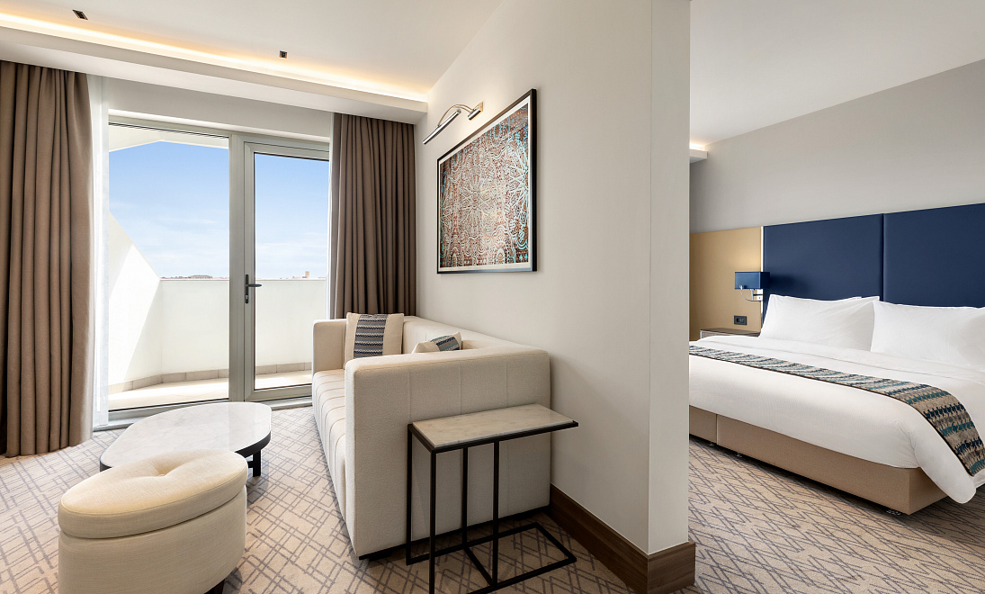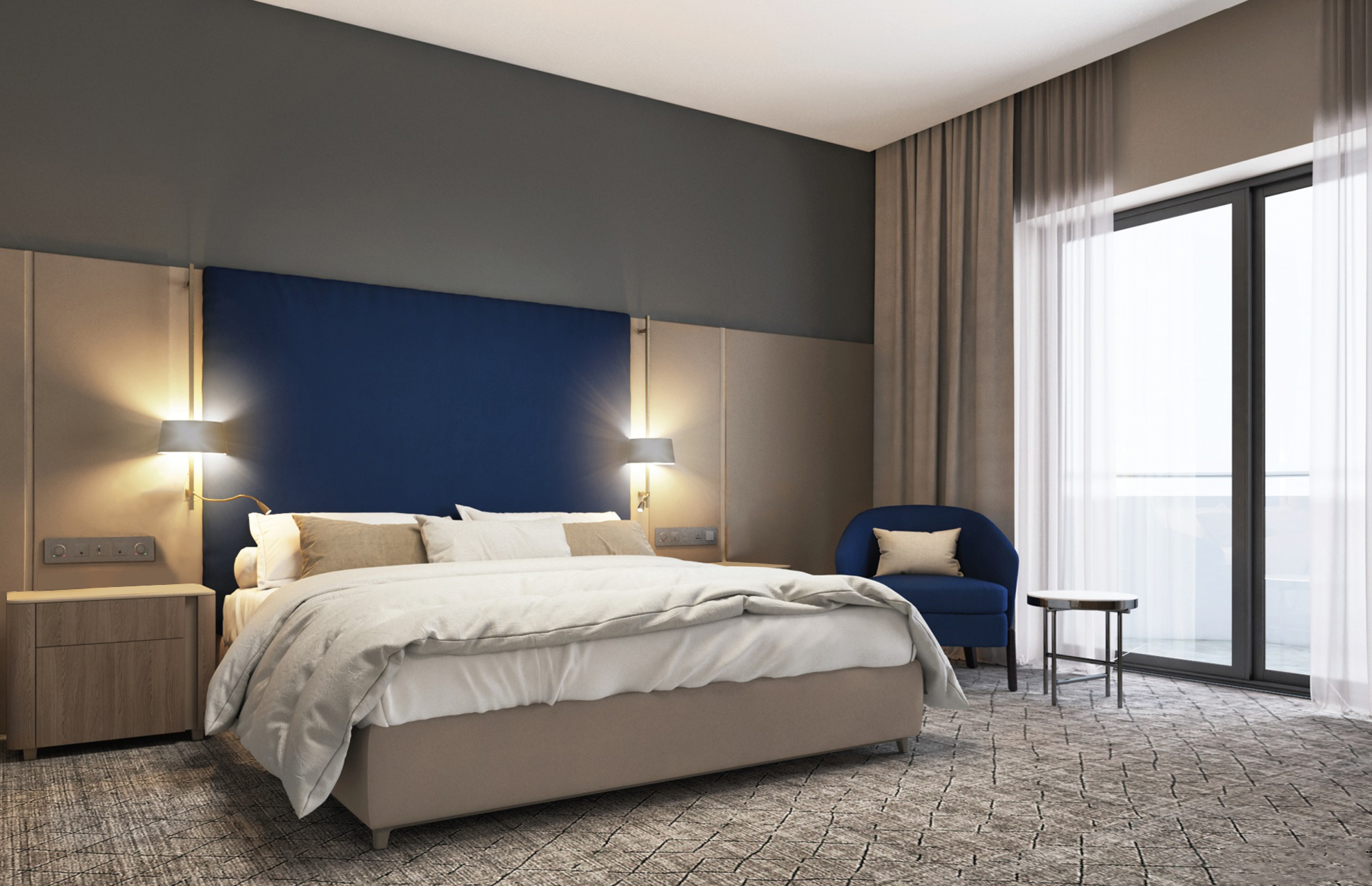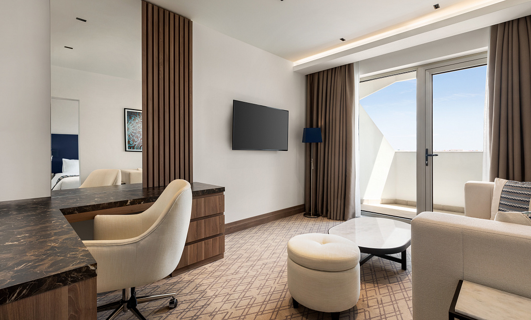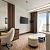 The rooms are designed for guests who value personal space and the division of the guest room into a working area and a relaxation area. Each room consists of 2 rooms: the first room is a living room with comfortable upholstered furniture, a large smart TV, a desk and armchairs; the second room is a comfortable bedroom with a large double bed, a wardrobe with all the necessary accessories inside. Each room has a separate bathroom with a shower, made in a modern style, equipped with all necessary cosmetic and bath accessories - a hairdryer, slippers, a set of towels and toiletries. There is also an additional private bathroom for visitors. The rooms are equipped with a mini-bar, electric kettle, tea-coffee set, updated on a daily basis. Each room has an iron and ironing board. The area of this room is approximately 42m2.